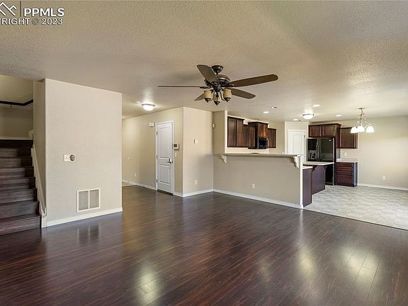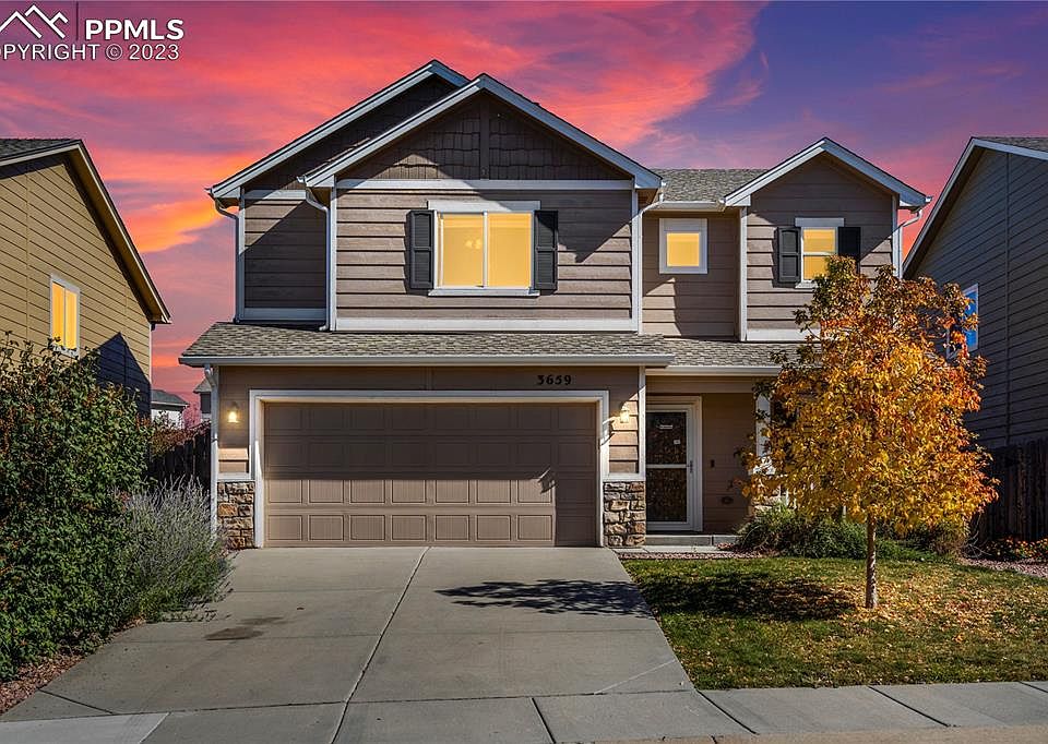 Charm, Convenience, and Colorado Springs Cool in Mule Deer Crossing! Welcome to a home where every feature echoes the vibrant spirit of Colorado Springs. Begin your journey with the front yard, where delicate landscaping invites smiles and casual hellos, and the intimate porch suggests a haven of relaxation. Slide into the driver's seat of not one, but two cars? Your vehicles will find their perfect spot in the generous two-car garage. Upon entry, the home's interiors surprise and delight. Rays of sunlight playfully dance across an expansive open floor plan, setting a backdrop for memories yet to be made. The vinyl flooring, rich and enduring, offers elegance without demanding attention. The heart of the home, the kitchen, is designed for both the seasoned chef and the midnight snacker. With its chic island, it's ready for morning coffee chats, evening meals, and everything in between. For the ever-gracious host, a convenient half bath downstairs ensures guests' comfort at all times. Beyond daily living, this abode understands life's little necessities. A dedicated laundry room, armed with a washer and dryer, promises to make chores a tad more delightful. Ascend to the living quarters, and the primary bedroom stands out, not just as a sleeping space but as a sanctuary. Its accompanying en suite bath, fitted with dual sinks, promises ease on busy mornings, while the rotating wall mount ensures your favorite shows are just a glance away. Comfort finds its mark in every corner with ceiling fans adorning each bedroom and the central living area. Your outdoor oasis awaits in the backyard, where a thoughtfully designed rock-grass combination offers a versatile space with minimal upkeep. Beyond the walls of this residence, an unbeatable location beckons. Picture this: a spontaneous 5-min drive for a movie night at Cinemark or a leisurely 13-min trip to indulge in retail therapy at Citadel Mall. Experience the fusion of convenience, comfort, and charm.