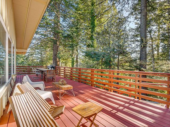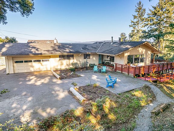 Situated in an exclusive quiet location of Myrtletown this 3 bedroom single level home sits amongst Redwoods with views of Humboldt Bay. This stylish mid century home has an expansive and open floor plan with lots of windows and lots of light. Wood stove, woods floors, updated bathroom. A beautiful wrap around deck is perfect for outdoor living while enjoying the beautiful setting. This oversized lot includes developed trails throughout the Redwoods, RV parking and space to add a mother in law unit.