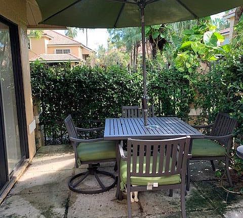 Contemporary 2 story townhome with lots of green space! Steps down to open great room with clear story windows and sliders to enclosed patio, opening to 2 additional patios for BBQ, peaceful garden views, lots of privacy, eat-in kitchen, separate laundry, 2 bedrooms on second floor, Master Bath has frameless shower. full den with French doors, closet space & half bath on first floor.
