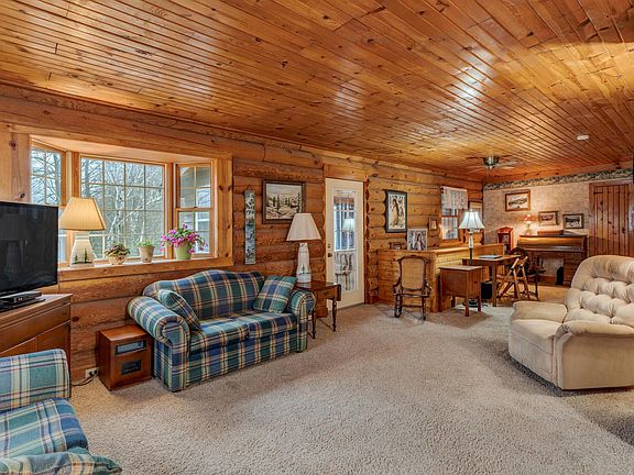 This Log home sitting on almost 60 acres, is just one egress window away from being a 4 bedroom home. This rustic home features a wood burner, 3 season porch, and a large pole barn.