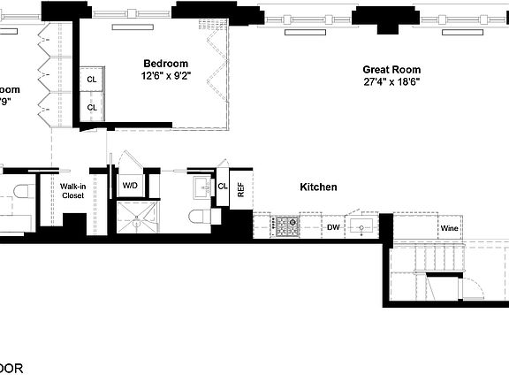 The entry hall features the building's original terrazzo-tiled floors, leading to a stunning double-height atrium that floods the living space with natural light all day. The large and beautifully proportioned living/dining room features a gas fireplace and built-in shelving. Open to the living/dining room is the sleek chef's kitchen, with top-of-the-line appliances including Miele induction cooktop, oven and integrated dishwasher, and Sub-Zero side-by-side refrigerator/freezer and wine storage unit.