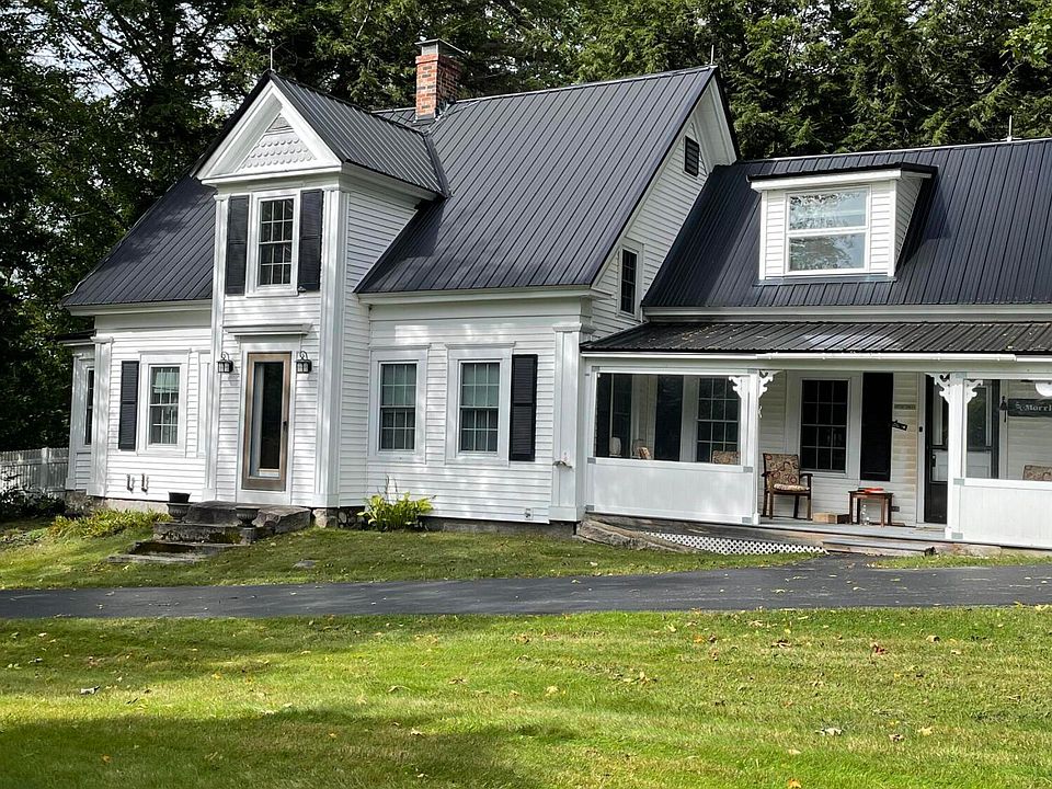 Ca. 1850's classic Maine Farmhouse with attached Barn. Total of 63 acres+/- now included . 52 acres on same side of road as house with 42 in TG, about 5 in pasture; Additional 11 acres mostly pasture across road. Many upgrades: vinyl siding; metal roof; heat pump; AC; 14kw Generator ; Replacement 4 BR leach field 11/23 ; westerly Mountain Views