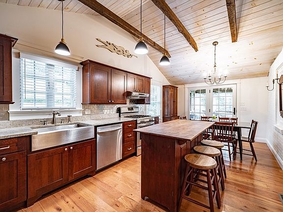 - Features: Beamed Ceilings, Vaulted Ceiling(s), Flooring - Wood, Dining Area, Countertops - Stone/Granite/Solid, French Doors, Kitchen Island, Stainless Steel Appliances