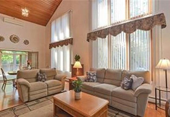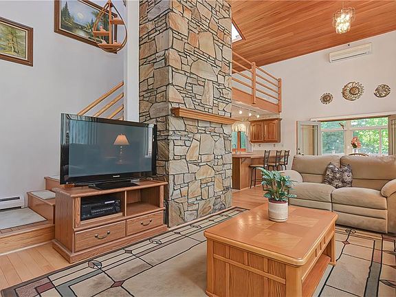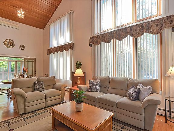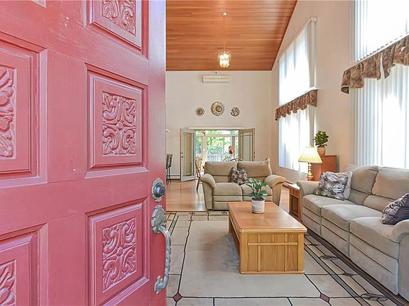 A beautiful, custom build contemporary awaits! This one-owner home welcomes you with a light filled living room featuring extra large windows, cathedral ceiling, gorgeous stone wall and charming wooden ceilings. The living room opens to the kitchen with dining area and island for additional seating which leads out to the fabulous sunroom perfect for spending a relaxing day. Sliders from the sunroom take you to the lovely private yard. Unwind after a long day in the primary bedroom with deck overlooking the yard or spend time with family in the finished lower level with wood stove. This bonus lower level also features a laundry room, workshop and bulkhead. Also boasting a wonderful patio, sprinkler system and three car garage. On a gorgeous wooded, corner lot! Subject to probate.
