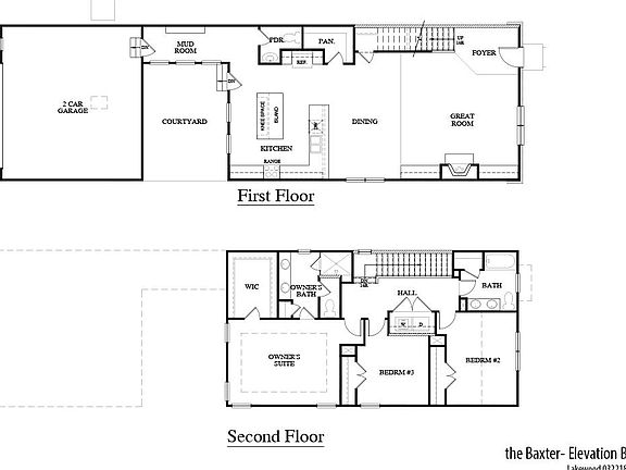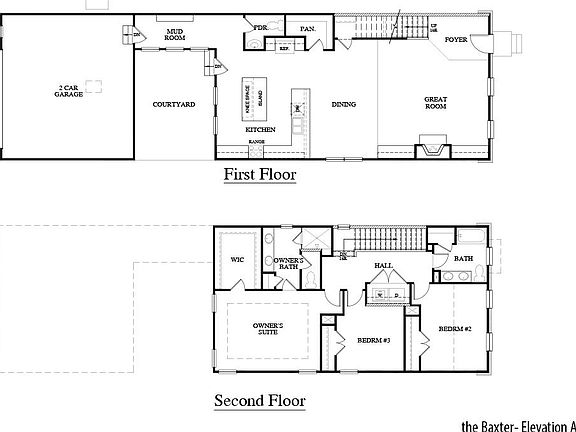 This newly designed, courtyard Baxter A plan has plenty of curb appeal with the 2 car garage neatly tucked in the back. The inviting foyer opens directly into the great room featuring a beautiful fireplace. The great room is fully open to the dining area, which then opens to the kitchen. The large, open concept kitchen features a spacious island, walk-in cornerpantry, and direct access to the outdoor courtyard area perfect for entertaining. The main level of this plan is complete with a powder room, mud room, and attached 2-car garage. The second level of this plan features the luxurious owner's suite complete with a walkin closet, dual vanities, and an oversized shower. Finishing off the second level are 2 secondary bedrooms, a secondary bathroom, and space for your washer and dryer.