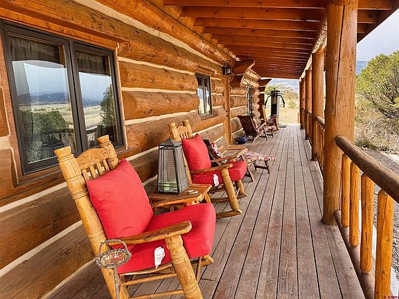 Nestled on over 40 sprawling acres, this stunning hand-hewn full-log home offers breathtaking 360-degree views and the perfect blend of rustic charm and modern comfort. With over 2,300 square feet of finished living space, this three-bedroom, two-bathroom retreat features an inviting open-concept design with vaulted ceilings that enhance the sense of space and warmth. The well-appointed kitchen boasts double ovens, a propane stove, a farmhouse sink, a dishwasher, and a refrigerator/freezer, making it as functional as it is beautiful. The main floor hosts the master suite, a guest bedroom, and a full guest bath, while upstairs, a spacious additional bedroom and a loft office overlook the living area below. A delightful hidden playroom adds a whimsical touch for the little ones. Just a short walk from the back deck, the oversized two-car garage/shop provides ample storage and workspace. Surrounded by rolling terrain and mature trees, the property offers both privacy and a natural windbreak while attracting an abundance of wildlife. From the front covered porch, take in the million-dollar views of the San Juan Mountains, with easy access to nearby forest service land. Located in Wildlife Management Unit 80, the area is renowned for its abundant wildlife, including elk, mule deer, black bears, and even the occasional moose or antelope. With over-the-counter tags available for elk rifle seasons, this property is a dream for outdoor enthusiasts and nature lovers alike.