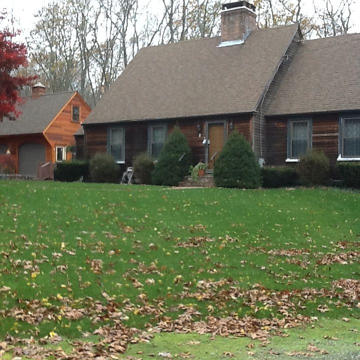 1974 Cape half house ,cedar clapboard exterior with deck and 2 story, 2 stall detached carriage house garage(also cedar clapboard). Huge granite fireplace in Family Room, brick corner fireplace in living room. Library with cherry cabinetry. Three plus acres of wooded property with expansive, landscaped front lawn.