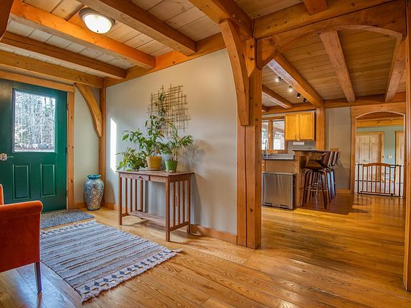 Welcome to this warm and inviting Timber Frame on 12+ acres by Groton State Forest. Between the property and the park, you will find endless outdoor recreation and some of Vermont's finest snow machine trails only minutes from home. The open concept floor plan features 3 stories with 2 lofts overlooking the living room with a soaring 3 story stone fireplace. Use the first floor office space and available/installed Spectrum High speed internet and cable to work and or learn remotely. The 2nd story offers 2 beds and one full bath plus a spacious loft area. The 3rd story is a large and open bonus space with loft and is currently used as and additional bedroom. Walkout basement includes a spacious master suite with large walk in tile shower. The fully applianced kitchen boasts new quartz countertops and soft close cabinets with stainless pull outs. The huge 34x23 garage has ample room to store your vehicles and all your toys.