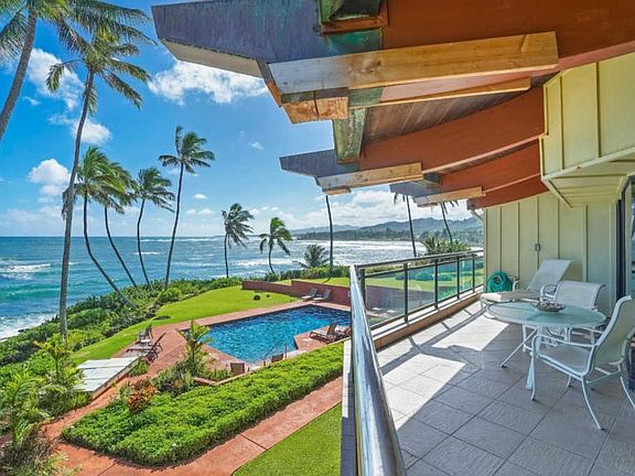 WOW! VIEWS EVERYWHERE! This is a RARE OPPORTUNITY to own in this beautiful property! Check out the views from this amazing property located on the famous Coconut Coast of Kauai!Hale Awapuhi is a boutique condominium complex with only 9 units. This unit, located in the center of the property, is the only condo that has no unit above or below and takes advantage of the 180 degree views from north to south stretching from Lae Nani Beaches to Lydgate Beach. The views from the condo are like no other on the East Side of Kauai! The large lanai is the place to relax and enjoy your morning coffee, watching the amazing sunrise over the Pacific that accompany living on the East Side. The evenings bring a different kind of beauty with beautiful skies full of various colors from the reflection of the sunset from the South Shore. From your lanai, you will also enjoy watching dolphins, whale watching and the occasional sea turtles and seals. And we can't forget the countless rainbows you will see from this location!The condo has 2 masters and 2 bathrooms. The first master bedroom is located on the main floor and the second master is a loft style bedroom overlooking the large living area. The vaulted ceilings give the condo a commanding feel, and the layout takes advantage of the amazing views all around you.The inground pool is perfectly situated to enjoy more views and gives direct access to Lae Nani Beach. The grounds are perfectly maintained, one covered parking spot and a private storage space comes with the unit.Hale Awapuhi is the perfect place to live full time, or take advantage of the condo being located in the Vacation Destination Area (VDA) and vacation rent this for short term stays. Or live here full time and when you're traveling, rent it out to vacationers! Sold fully furnished. The association fees are the most reasonable you will see for condo this size, it's almost unbelievable!Come see this condo before it's gone!