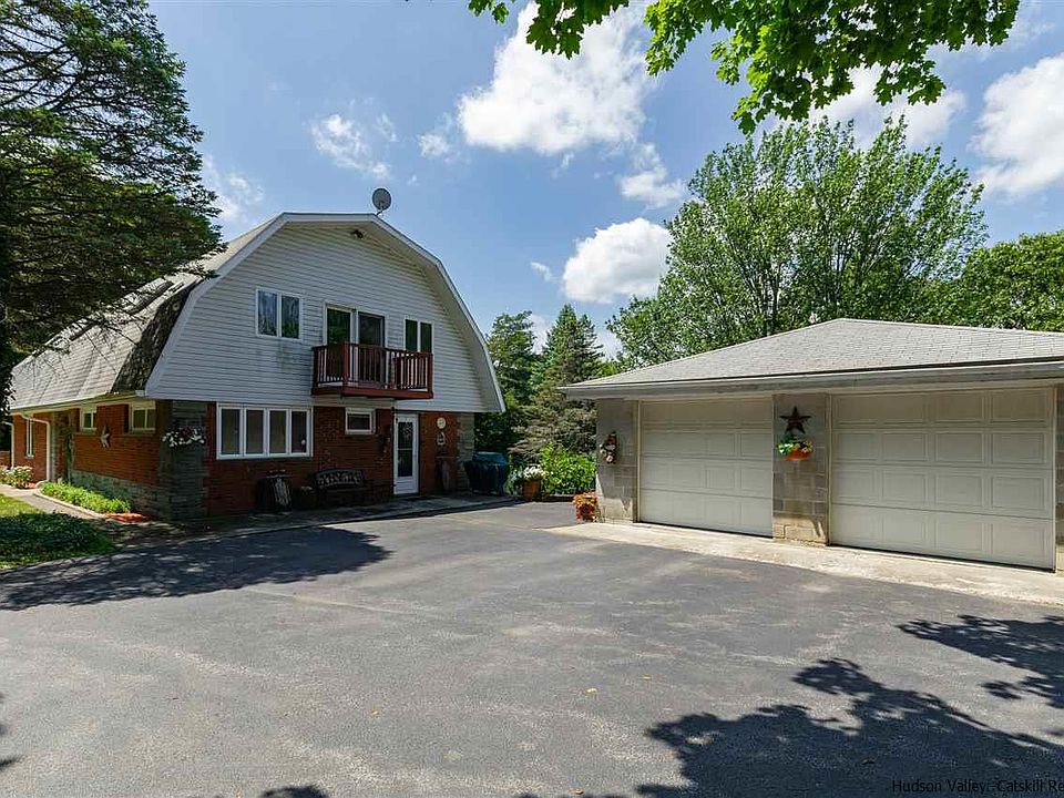 You will be pleasantly surprised when you enter this lovely home. See the WOW affect this magnificent property has to offer .Love it the way it is, or finish it to your liking. There are so many possibilities. Lots of room for your comfortable sofas, chairs and more in the huge great room. Beautiful wide board flooring, 3 sets of French doors leading to the wrap around deck and a wood burning stove add to the beauty of the room. The very spacious dining room is perfect for large family gatherings and also has access to the deck. So complete and well planned, the eat-in kitchen is an inspiration any cook. It features plenty of cabinets, a breakfast bar, pantry and has a door that is steps away from the detached 2 car garage. Just off the kitchen is a large room that can be used as a family room, office or possible guest room. The tremendous master suite glows with warmth and comfort. There is room for a king size bed and more. French doors to a small deck, 2 walk-in closets and full bath with jetted tub complete the suite. The two additional bedrooms are a good size with one having French doors to another small deck. Conveniently located on the second floor is the laundry room with slop sink. The walk-out basement is partially finished with a large playroom and 2 storage areas. Large detached 2 car garage with small storage area below. Relax on the wrap around deck or sit on the patio and enjoy nature that surrounds this wonderful home. Like to walk, stroll down to the river and enjoy the peaceful view and setting. Roof approximately 15 years, 2 zone heat/central air, some windows replaced, new microwave, 200 amp service, updated 1/2 bath, septic and well replaced. Located only Minutes to the NYS Thruway and the Mid-Hudson Bridge. Don't miss out seeing this wonderful home nestled on 1.7 acres.