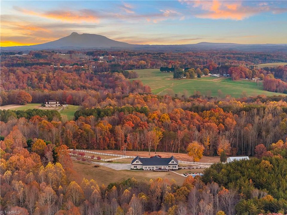 Discover refined country living on 16.52 gated, private acres offering timeless elegance and natural beauty. This custom all-brick, one-level home with a partially finished basement offers 4,481 sq. feet, 3 bedrooms, 5.5 baths, featuring an stunning gourmet kitchen perfect for entertaining family & friends. The finished basement includes a kitchenette, full bath, & separate entrance, ideal for second living quarters, an in-law suite, or multi-generational living. Relax in the sunroom overlooking the covered back patio with hot tub, inground pool, & wooded backdrop where deer are often seen grazing. The home has an attached 3-car garage and a separate 2-car garage, currently used as a barn, large enough for an RV, and previously used as an airplane hangar. With fenced pastures, a dog run, and two cattle stalls, this property is ideal for animal lovers or hobby farmers. Just 1.8 miles from Mount Airy Surry County Airport, this estate combines luxury, versatility, and rural tranquility.