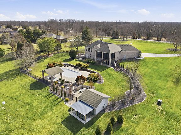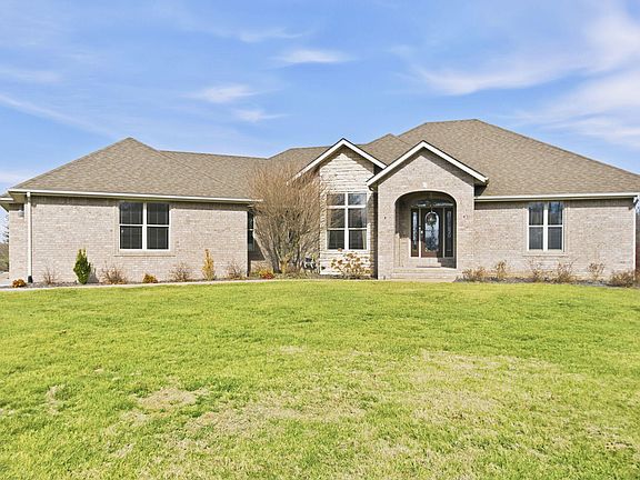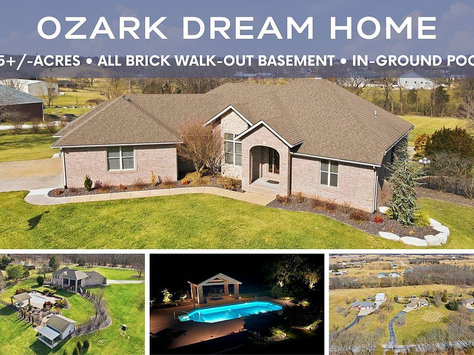 Welcome to this all brick walkout basement home nestled on 3.5 acres in Ozark, offering space, privacy, and your own backyard oasis complete with a 39x19 inground pool. Inside the covered front entrance, you are greeted by a spacious living room featuring vaulted ceilings and a stunning see through stone fireplace that creates a warm focal point between living areas. Just off the entry is a bright front office, perfect for working from home. The kitchen is designed for gathering with wood cabinets, stainless appliances, tile backsplash, island with barstool seating, and an attached dining area. A cozy hearth room sits just off the kitchen, and nearby you will find a powder room and a laundry room with sink and folding table. The main floor primary bedroom offers a private retreat with dual sink vanity, walk in tiled shower, jetted tub, vanity area, and a large walk in closet. The walkout basement features a spacious second living area with wet bar, fireplace, and access to the covered lower patio, along with two additional bedrooms and a full bath, ideal for teenagers or guests. A John Deere room provides excellent storage space and includes a dog wash station! Step outside to enjoy the screened in porch, covered patio lounge area, hot tub that is negotiable with the sale, pool house with covered dog runs, and metal fenced area, all surrounded by the beauty of acreage living while still being close to Ozark amenities.