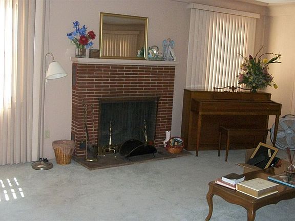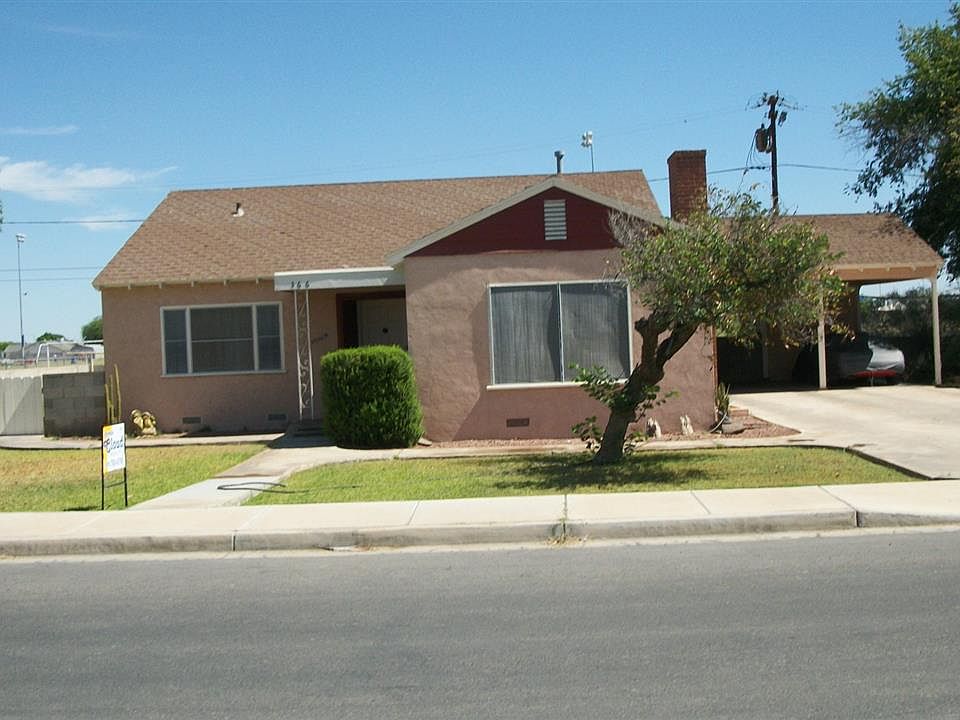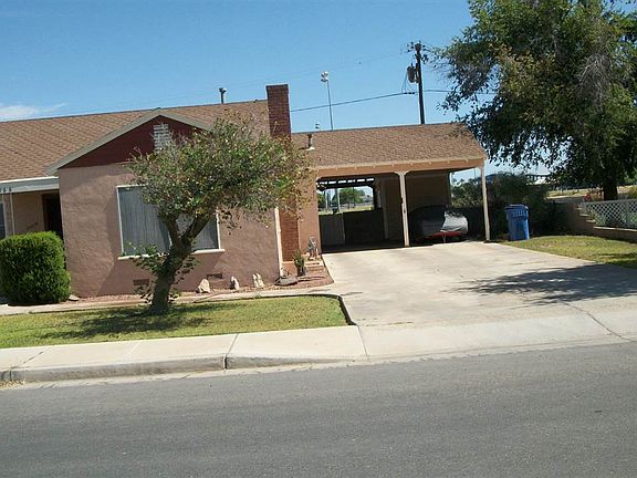 Charming Home sitting on 2 lots with 3 Bedrms., 1 3/4 bath or could be used as 2 Bedrm. and office. The Living Room is good size with a beautiful wood burning fireplace and formal dining room, plus a kitchen with tile counters, loads of storage and Refrigerator. This home has a large back yard and front yard with lush landscaping and greenery. The Covered Patio is very large and has tile for easy maintenance and family get together's. Double Carport and extra storage room built in the rear yard.