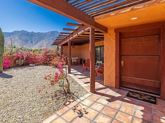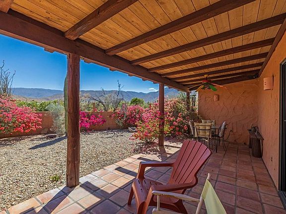 This 3 bedroom 2 bath home is custom designed in the Santa Fe style with influences that include a unique exterior stucco and interior walls with Satillo tile throughout that add character and authenticity to the home's aesthetic. The pool enhances outdoor living, providing a refreshing retreat during warm weather. Patios both at the front and back of the home offer spaces for outdoor dining, relaxation, and entertaining with a private courtyard at the entry creates a welcoming and intimate space. The property is situated on a large corner lot, providing privacy and outdoor space. Custom wood cabinets, doors, and ceilings contribute to the home's craftsmanship and personalized feel. Overall, this Santa Fe custom-designed home seems to offer a blend of traditional charm, modern comforts, and indoor-outdoor living. Owned solar.