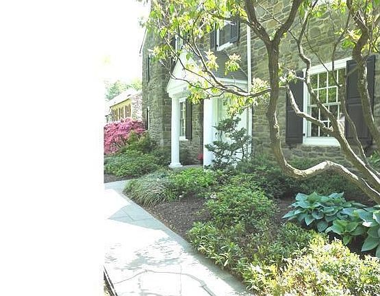 A stately stone colonial built by famed Mahoney Builders, surrounded by exquisitely landscaped gardens amid a bucolic family neighborhood; also convenient to corporate centers & local rail. Hardwood floors grace most of the home including the foyer. The beautifully appointed formal living room enjoys an expansive bay window, gas fireplace and built-in bookcases. The dining room bay window overlooks the flagstone patio and leads to the updated and expanded Brookhaven kitchen. A cook's joy, the kitchen includes granite counters, stainless steel appliances and copious cabinetry. The addition of a contiguous family room with Pella windows and French doors, cathedral ceilings, recessed lighting, access to the 2 car garage or the spectacular garden provides for quietude or entertaining. Upstairs 4 graciously proportioned bedrooms & two updated baths accommodate the most discerning buyer. A bibliophile's delight continues in the lower level with office, 2nd powder room, separate laundry. Newer HVAC. Walk-up attic.