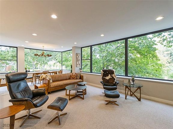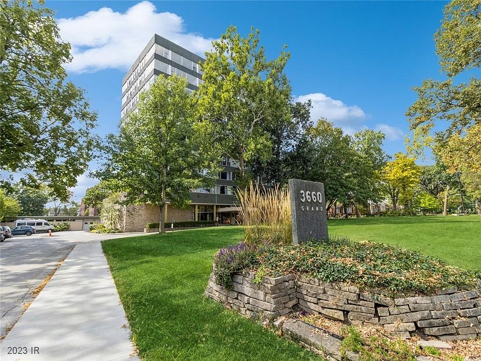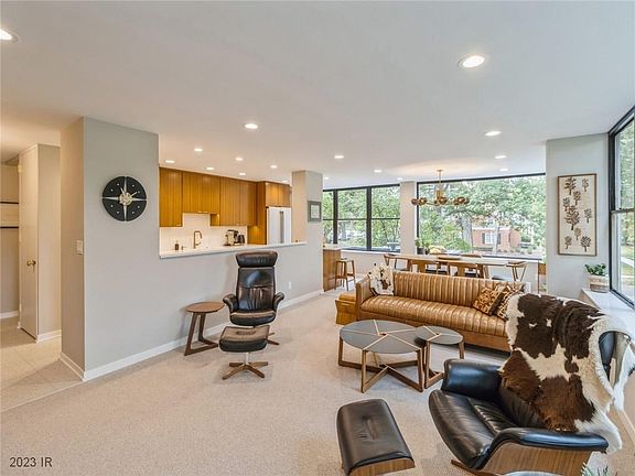 This classic Mid-Century modern condominium in Des Moines on historic Grand Ave is wrapped in windows which offer abundant light in a picturesque setting. The location is close to downtown and the Ingersoll shopping and dining area with easy access to I-235. A grocery store, pharmacy and bank are located in easy walking distance. This spacious 1,752 sq. ft. unit has 3 bedrooms and 2 bathrooms and in-unit laundry room. It was COMPLETELY renovated in 2020 including all new electrical and plumbing. Flooring consists of terrazzo styled porcelain tile, penny tile in bathrooms, and all-wool carpeting. Cupboards throughout the kitchen and bathrooms are custom designed and constructed from grain matched rift-cut walnut, with soft-close doors and drawers. There are high-end fixtures and quality features throughout the unit which stay true to the building's Mid-Century architecture. The building is constructed of concrete which eliminates any noise concerns. Other amenities include a heated outdoor pool, club room with kitchen, exercise room, and additional free laundry facilities. This unit includes the rare amenity of two deeded parking spaces in the heated attached garage. There are large built-in cupboards at both parking spots and a private, secure storage unit for more the ample storage. The building has secured access and a daytime on-site manager. HOA dues include EVERYHTHING but in-unit electric usage