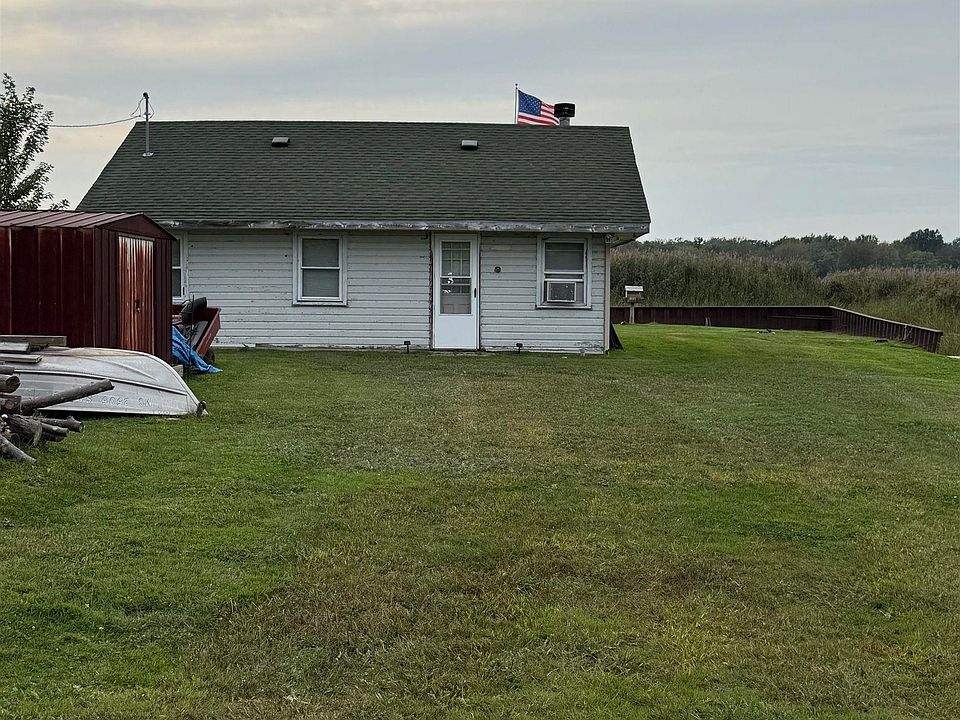Highly desired Middle Channel Waterfront! Summer cottage with 65' of steel seawall frontage plus a limited side canal. Vinyl-sided ranch with wood-burning stove in living room for heat, 2 bedrooms, kitchen, and 1/2 bath inside. Shower is outside, cottage setup. Beautiful sunset evenings. A good hideaway for fishermen, hunters, or pleasure boaters, opposite Dickinson Island. Frontage out from the seawall is 83'. Definitely a handyman special.