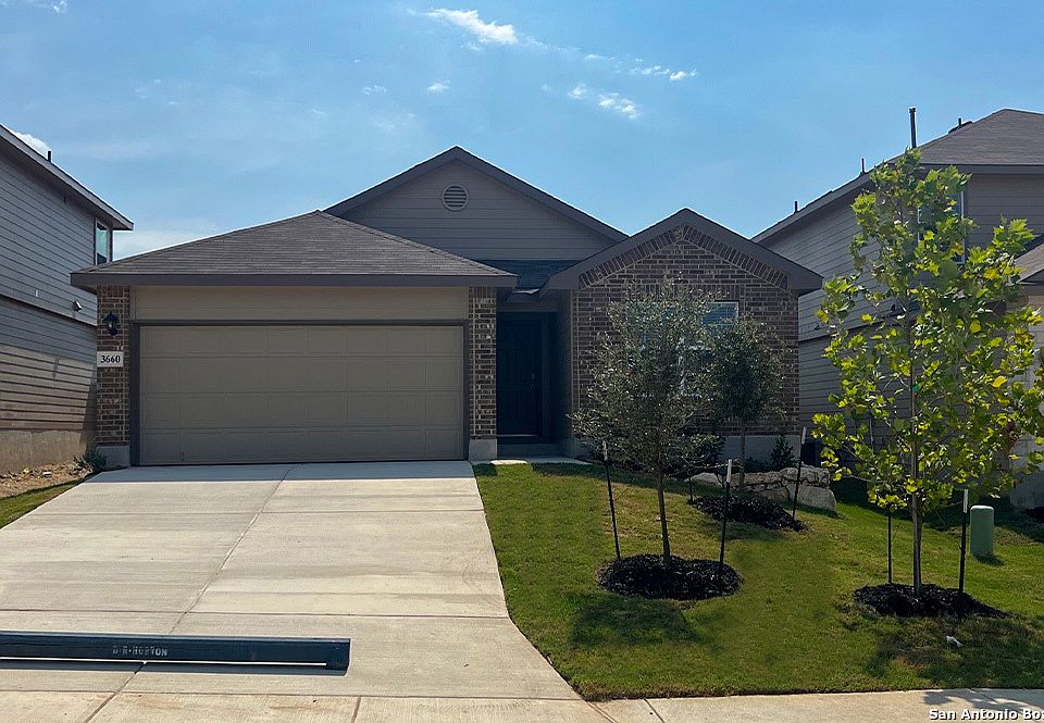 The Torre is one of our most popular floor plans. This single-story, 3-bedroom, 2 bathroom home features 1442 square feet of living space and a two-car garage. The inviting entry opens to a large dining area and an open kitchen with spacious granite countertops, stainless steel appliances, electric cooking range, stylish subway tile backsplash, and abundant cabinet storage space. The kitchen opens into the living room with plenty of natural light. The private main bedroom includes a nice ensuite with a double vanity sink, separate tub and walk-in shower, water closet, and a spacious walk-in closet. Secondary bedrooms, a second full bathroom, and a utility room are located off the entry. Additional features include tall 9-foot ceilings, 2-inch faux wood blinds throughout the home, luxury vinyl plank flooring at entry, family room, kitchen, and dining area, ceramic tile in the bathrooms and utility room, and pre-plumb for water softener loop. You'll enjoy added security in your new home with our Home is Connected feature. Using one central hub that talks to all the devices in your home, you can control the lights, thermostat and locks, all from your cellular device. Relax outside on the covered patio (per plan) and enjoy full yard landscaping and full yard irrigation.