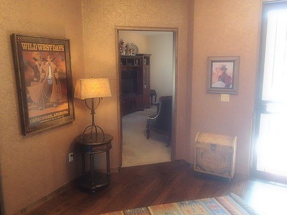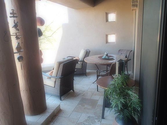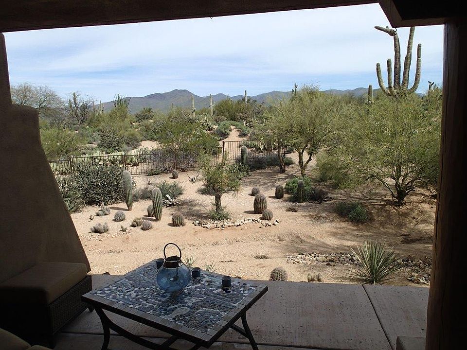Carefree Resort Living on this beautiful lower level unit. Perfect location within the Village with magnificent unobstructed views of the desert landscape and mountains at your backdoor. Fourteen recent upgrades including stainless steel appliances, hardwood flooring, Travertine surface on both the extended prime patio and guest patio. New granite kitchen countertops and a ten foot patio door added to complement mountain views. Main patio is situated for shade during the hot afternoon and evening hours. Many quality furniture items included and is ready to move in.
