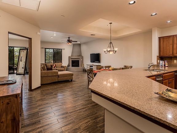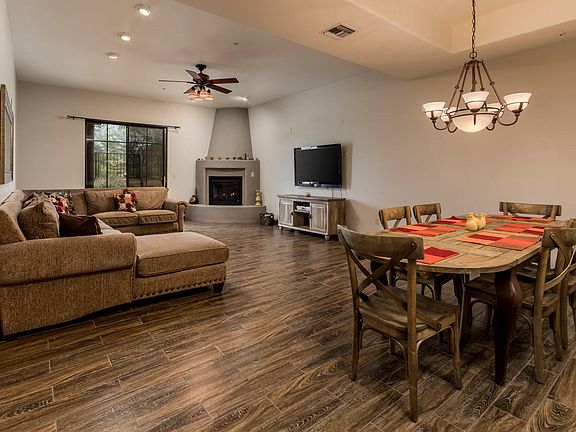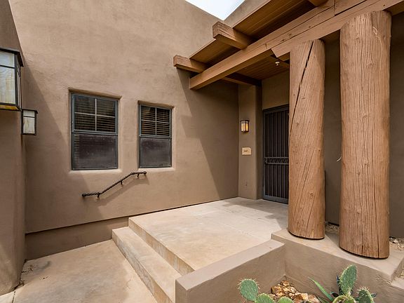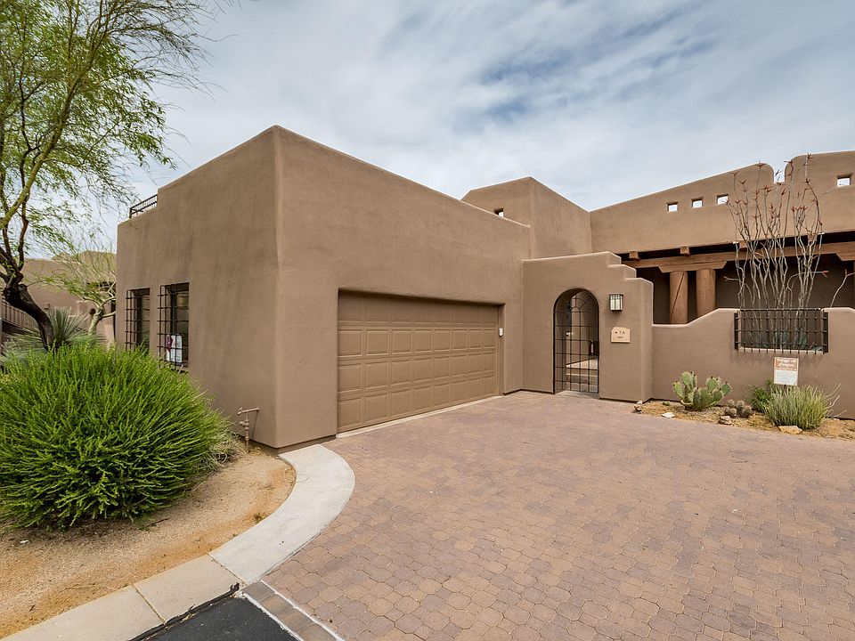 This Sante Fe style villa is a rare single level duplex unit with two master bedrooms, a rooftop terrace, and a two car garage. This rare floor-plan is the only one currently for sale in the complex. Perfect location within the Village with magnificent unobstructed views. Villa backs to the Desert Forest golf course and the Rooftop terrace has spectacular views of Black Mountain. The two master suites each boast luxury baths, one with a jetted tub, and both with walk in showers and wood grain tile throughout. The great room is anchored by a fireplace and an open spacious kitchen that is perfect for entertaining. The kitchen includes counter depth built-in refrigerator, gas stove, granite counter tops and a trash compactor. Desert, mountain or golf views from every window in the most secluded private lot in the complex. Your evenings can be spent relaxing on the back porch or roof top terrace enjoying the quiet of the desert. The community includes a resort style heated swimming pool, spa and putting green. This gated community lies within walking distance to downtown Carefree and the Civana Wellness Spa.