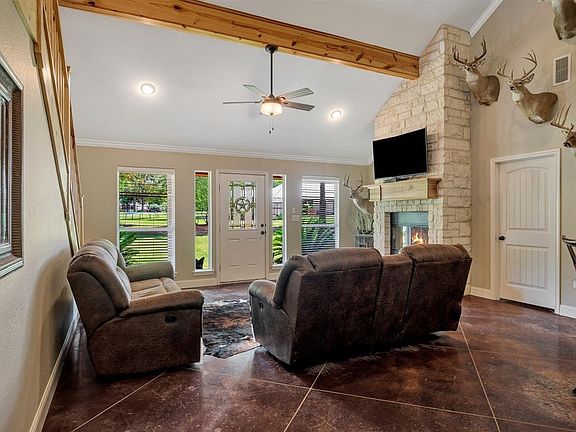 Beautiful stone & hardiboard home in a great country setting! Lots of space for your family with 3B/2B and a large upstairs loft. The living room has a floor to ceiling stone fireplace, scored floors and soaring vaulted ceilings accented with wood beams. A roomy kitchen with stainless appliances and a breakfast bar that opens to the living and dining areas makes for great family living. Relax in the master suite featuring a fireplace, cathedral ceiling & jet soaking tub. Great outdoor living on this large wooded lot, you will love to relax on the spacious front and back porches.