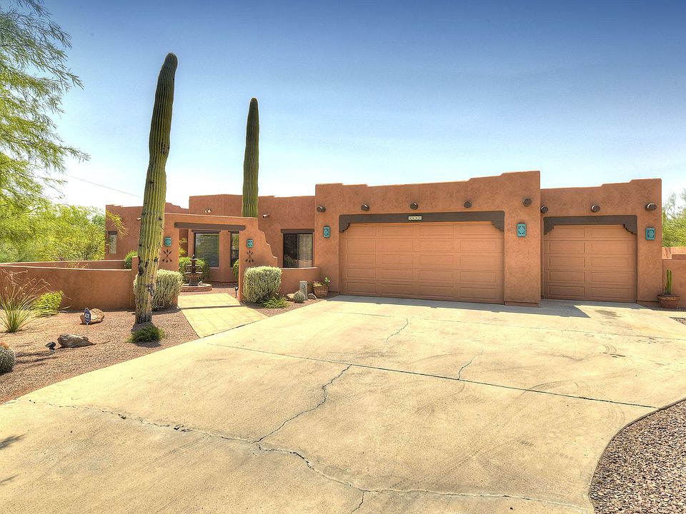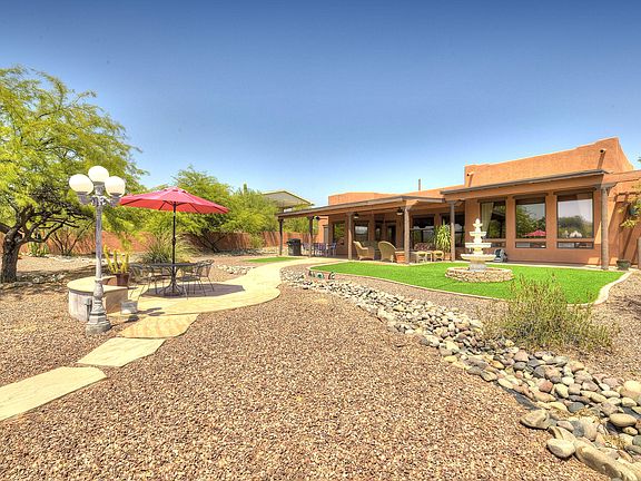 * Stunning Santa Fe home is sure to please with sky-hi exposed wood beamed ceilings, dramatic 2-way stacked stone FP and amazing southwestern elegance thruout! Beautiful courtyard entry w/fountain welcomes you into the foyer & stunning grtrm. Beyond that lies the beautiful kitchen w/warm wood cabinetry, tile cntrs & wraparound bkfast bar. Gorgeous living room for more formal gatherings. Huge walled in bkyd offers mountain views, an expansive cov'd patio, lovely landscaping & fountain. Generous Mstr Ste has dual sinks, jetted tub, separate shower & lg walk-in closet. Lovely neutral tile in all the right places. Big laundry rm w/storage & sink. Terrific split plan and ideal for entertaining. All situated on a .88-Acre lot w/no CCRs or HOA & plenty of room for your horse, RV & toys.