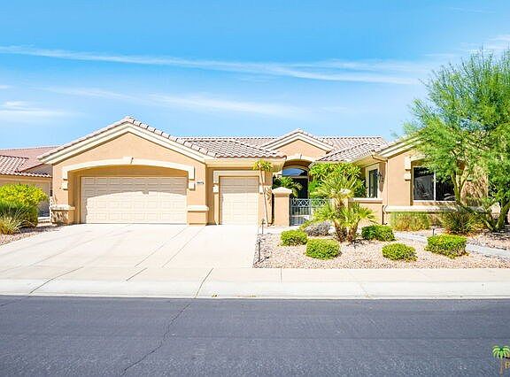 Sun City Palm Desert. A 55+ community of active youngsters living the best years of their lives. Golf, Bocce Ball, Swimming Pools, Restaurant, Fitness studio, and 70+ active social groups to consider. SOLAR POWERED HOME! 3 beds, 3 full baths, 2515 sq ft. tile floors thru-out. Dual zone HVAC system installed in 2016. High ceilings, large spacious rooms, covered outdoor entertaining w/misting system, and a beautiful rock water feature for ambience. Oversized garage is climate controlled. HOA $315 monthly includes 24/7 Gated w/security guard and all of the above amenities that take place at one of the 3 Community Buildings located on the property. Click on "Documents" Tab for Home updates and features.