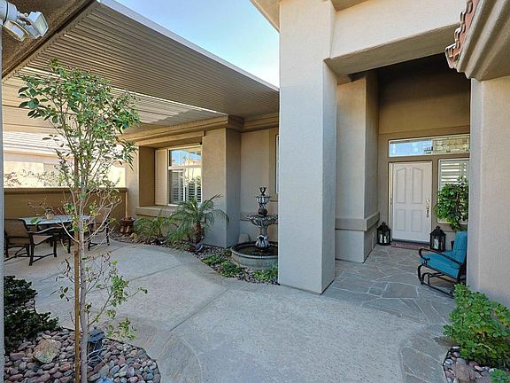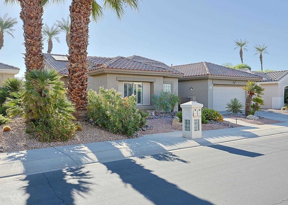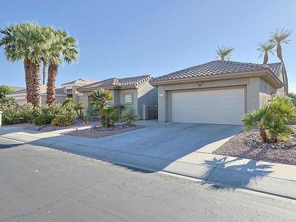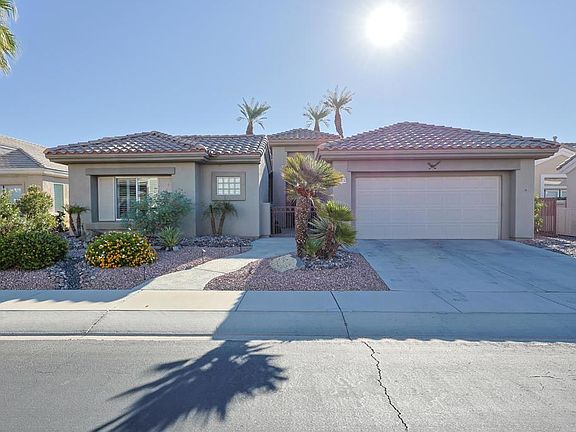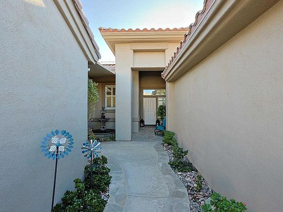 Beautiful "Morocco" floor plan with 3 bedrooms/ 3 Baths and den which includes a standalone Casita! This home is located in the award winning Sun City Palm Desert 55+Active Community. Gated 24 hour security. Upgrades of Over 230K in the last 2 years which includes, PAID Solar that was just installed in 2024-31 panels and a large battery that runs off the grid when needed, Patio covers in the backyard with misters and patio cover in the front courtyard going from the house to the casita. New Pool and Spa was installed in 2022 with 3 sheer descents, waterfall, and electronic pool app. BUT WAIT there is more-Back yard was completely redone with new decking, turf, fencing, and plants all in 2023. The inside of the house boasts high ceiling, crown molding, Shutters throughout, tile floor, large kitchen with newer appliances, sizable windows over looking award winning golf course! Need some rental income or place for family, the casita would be perfect with its own AC and a separate entrance. HOA is one of the lowest around and includes cable and wifi. The Sun City community has 3 restaurants,2 pro-shops, 3 clubhouses, 4 out door pools, 1 indoor pool, 2 fenced dog parks, 2 fitness centers, 2 Championship golf courses, bocce ball, pickle ball, tennis, bar, billiards and much more!