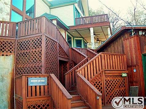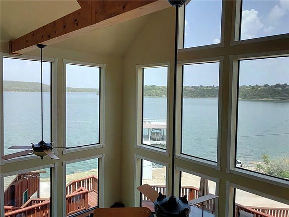 FABULOUS PK Lake Family Retreat with Guest Cabin and Bunkhouse on a wooded hillside setting of 3.3 rustic acres, overlooking Caddo Bay. STUNNING PANORAMIC lake views from this gorgeous 2892 sq. ft house with DEEP WATER, DOUBLE LEVEL DOCK with Boat and 2 Jet Ski slips and lifts, swim, sun platform, and 2nd level party deck. The house has spectacular A frame wall windows and cathedral beamed ceilings, to enhance the lake views, gourmet kitchen, huge dining room, master suite with private deck, gorgeous wood floors throughout, custom tile work, wood burning rock fireplace, all in a perfect lake entertaining, open living layout, with multiple outside covered and open dining areas, on the wrap around decks.