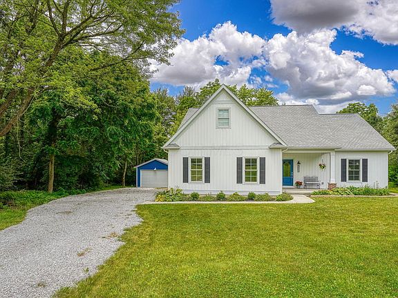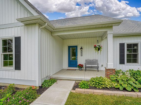 Built-in pantry cupboard and Stainless steel appliances. A large work island that opens to the dining area and great room. The extra-large mudroom/laundry room includes built-in cabinetry, pocket doors, and updated ceramic flooring, both functional and beautiful. The owner's suite is a true retreat with his and hers walk-in closets, as well as a luxurious bathroom with a tiled walk-in shower. Two additional bedrooms and a full guest bath are located on the opposite side of the home for added privacy. One bedroom was used as a home office/den but includes a wardrobe, making it fully functional as a bedroom. The full-sized basement with poured foundation and extra course walls is ready for your finishing touches. The mechanicals were thoughtfully placed to make future finishing easy. Outside, enjoy peaceful mornings and evenings on the new deck, surrounded by the sounds of nature. The nearly 5-acre lot backs to woods, offering your own private paradise. A 20x20 outbuilding with electric is perfect for a workshop or storing lawn equipment.