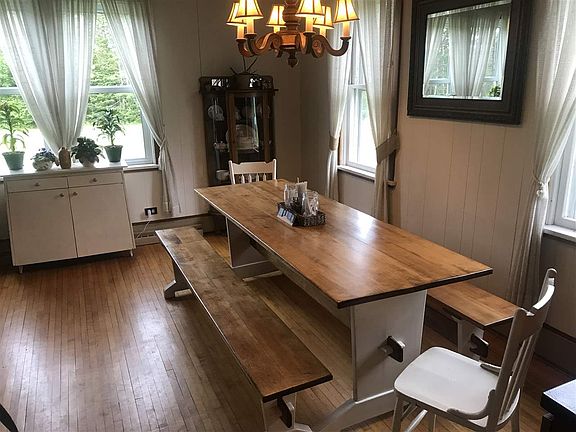 This is country living! A beautiful home on 80 acres, tall red pines, Trout Falls Creek running thru, a chicken coup with chickens, fire pit, animal enclosure, amazing yard with fruit trees and fenced garden. The home has lots to offer as well. The main floor has a large entry and sun room/sitting area, many entry closets for storage, a main floor laundry, large kitchen with updated appliances and tile flooring. There is an office den, an enormous living room and dining area as well as two full bathrooms. The second floor has all four large bedrooms. The basement is dry and offers three heat sources. There is a newer propane furnace, an oil furnace and a wood furnace. Choose your fuel or whatever is the best buy. Updated windows, recently replaced roof and rebuilt chimney. Roomy, move in ready and relaxing!