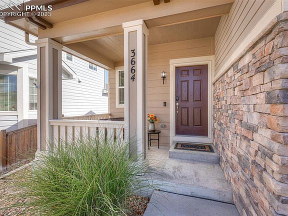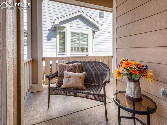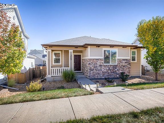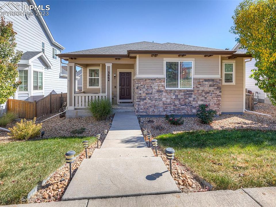 One level living in this like new ranch plan home, located in desirable The Meadows neighborhood! Great curb appeal with beautiful green lawn, stone accents, and covered porch as you enter the front of the home. Inside, wood laminate floors go throughout the open floor plan entertaining area, consisting of a large living room with vaulted ceilings, separate eat-in area with bay window, and updated kitchen. There is a walk out to the fenced back yard and access to the 2 car attached garage. The kitchen features a large center island, granite counter tops, gas range, pantry closet, and in ceiling lighting. The laundry is conveniently located on your way down the hall to the bedrooms. The primary bedroom has a walk in closet and attached bathroom which has tile floors, double sink vanity, new lighting, and a brand new walk in shower! Two good sized bedrooms with ample closet space and another updated full bathroom complete this home. Some other great features are newer dishwasher & fridge, whole house humidifier, automated thermostat, door keypad & ring doorbell, Central A/C! Conveniently located across from neighborhood park/open space, close to schools, shopping, and easy access to I-25!