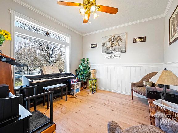 Nestled in the heart of Eagle, this stunning 5-acre equestrian estate offers a harmonious blend of rural charm and modern convenience. Designed for horse enthusiasts and hobby farmers alike, the property boasts a large pasture, a separate riding arena, several smaller pastures for smaller animals, a tack room, and a hay shed—all perfectly tailored for an equestrian lifestyle. The expansive manicured yard features mature trees that create a serene and private setting, this property is as functional as it is picturesque. A massive 35x25 shop with power and a 9-foot door adds versatility for storage or projects.The custom-built home is equally impressive, offering six bedrooms and five bathrooms across its spacious layout. The main level includes a luxurious master suite complete with a walk-in shower and soaker tub, while the upstairs has been refreshed with new flooring and paint. A partially renovated basement provides a blank canvas to customize to your taste.