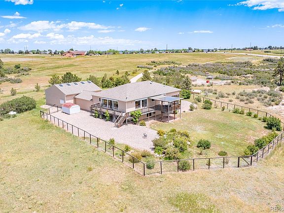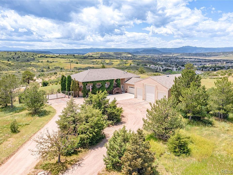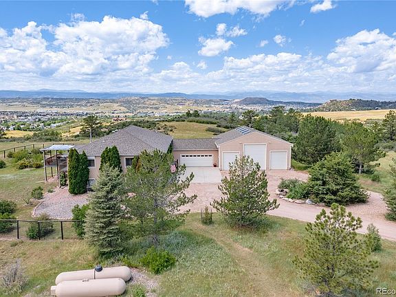 This magnificent property sits on almost ten acres surrounded by lush landscaping and incredible mountain views. With over 4,600 square feet and 5 bedrooms and 6 bathrooms, there's space for everyone. A large covered front porch overlooks the circular drive and the attached two-car garage and enormous workshop with over 1,400 square feet. Inside, the open concept living and dining area feature floor to ceiling windows with electronic solar shades framing the Rocky Mountain front range. The wrap around deck gazes out upon the beautiful pond and fully fenced backyard amid the backdrop of Pikes Peak and the Sleeping Indian. The kitchen features custom cabinetry, stainless steel appliances, and a separate hot water tank under the kitchen sink. A cozy music room features a gas fireplace, and double pocket doors to take advantage of the mountain views yet again. The owner's suite enjoys access to the back deck and an attached bathroom. Two additional bedrooms on the main level share a jack-and-jill bathroom, while an additional full bathroom allows for many options. A convenient mud room sits outside of a half bathroom as you enter from the garage. Downstairs, the recreation room is large enough to host your favorite games and capitalizes on the views once more in this thoughtful raised ranch design. Separate basement living quarters include a kitchenette, two additional bedrooms, and two additional bathrooms. Completing the basement is an oversized office space and substantial storage room. The pride of ownership shows in the energy efficient passive solar system, and the well designed mechanical systems in place in this unique home. Come and stay a while. There is so much to explore in the incredible native outcroppings and cave on the property. This private oasis is nestled just minutes from downtown Castle Rock, the Douglas County Event Center, and I-25.