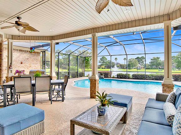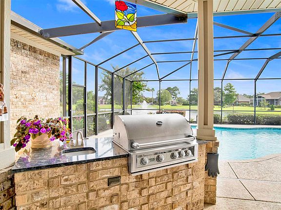 Surrounded by golf courses and situated on a picturesque lake, the views from this home are breathtaking! Upon entering this custom built 3BR/3BA pristine ranch home, you will experience a sense of spacious elegance. The open floorplan is filled with light from its numerous windows and glass doors, framing a picturesque view of the lake and fountain, across the beautiful outdoor space. The enchanting covered patio with its brick outdoor kitchen, anchors the entire home to create the perfect space for entertaining, and opens up to a sparkling gunite saltwater pool and waterfall enclosed in a beautiful lanai. The large family room is open to the kitchen, and features modern built-ins and a wall of glass doors that provide a seamless view into the outdoor space. The kitchen boasts custom cabinetry and tasteful granite, with custom lighting and high-end appliances. The dining room is enveloped in designer wainscoting, with lake views and access to the outdoor space. The primary bedroom has its own view and access to the pool area, with a trayed ceiling and sitting area, large ensuite with a custom walk-in shower, jetted tub, double vanity, and an expansive closet with built-ins. In addition to the two generous guest rooms, there is an office with built-ins and separate library room. No luxury has been spared in this custom home from the high ceilings and 8' doors, coastal woodgrain tile, triple crown, plantation shutters, whole-house air purification system, security system, tankless water heater, water purification system, right down to the curbed and manicured landscaping! This home is Gold Fortified with full brick and stone exterior including brick quoins and downlights, and custom vinyl soffit/facia for maintenance free living. There is an oversized attached two-car garage with additional storage, as well as an attached separate single car garage, perfect for a third vehicle or golf cart. 3-minute ride to the clubhouse! Golf cart is negotiable.