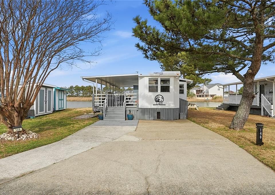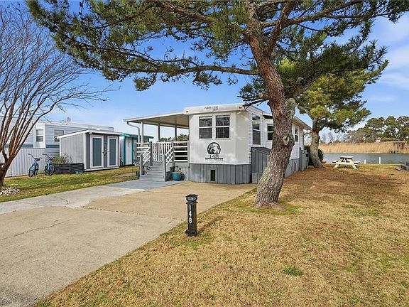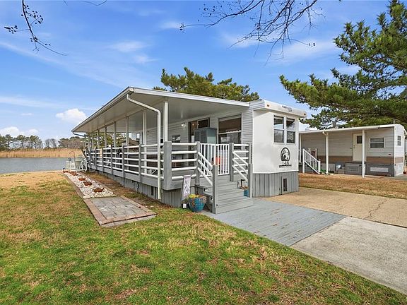 Enjoy your slice of Paradise at Surfside at Sandbridge beach! Beautifully designed Resort property with panoramic waterfront views of Back Bay located across from the Atlantic Ocean! The oversized waterfront lot boasts a huge covered porch for gathering or sunning & a composite dock for enjoying sunset gazing, kayaking or more! Inside, the refreshed coastal design impresses with bright & airy paint & decor, LVP flooring, Main Bedroom with Queen size bed, Full size Bathroom tub/shower combo & ample Storage! Kitchen with Full Gas range, Cast-iron sink, & stand-alone Fridge! Enjoy sofa sleeper, 2 Glider Recliners, & Electric Fireplace in the living area! Bonus: 2 storage sheds, 4 car parking, golf cart parking pad. Lot price $360,000 and the deck, sheds, RV & all contents convey for $75,000.Total 435K. $333 Monthly Fee incl water, sewer, basic cable, trash & ground maintenance. Amenities:Community Playground, Pools, Gym, Volleyball, Tennis/Pickleball, Boat ramp, Laundry/shower facilities