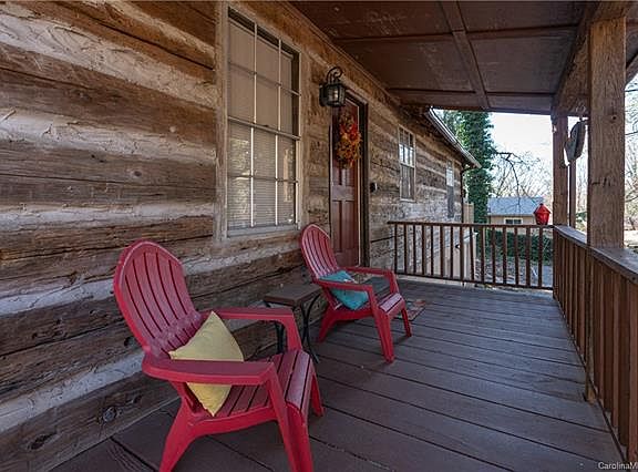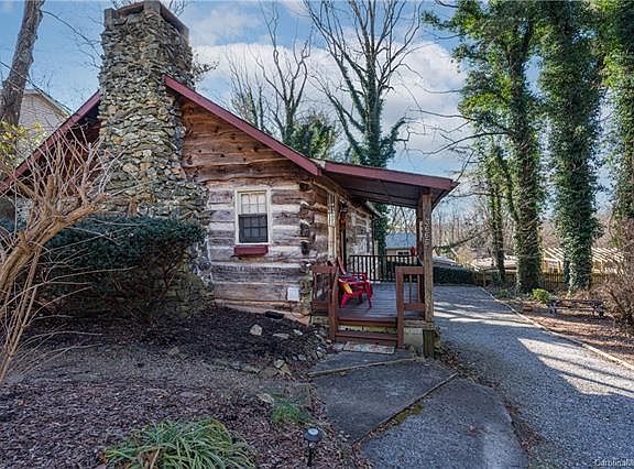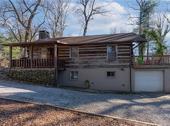 This original hand-hewn rustic log cabin has been lovingly restored and updated. Go back in time as you relax by the wood burning stone hearth in the upper living area of this 1950's gem. Or warm up by the lower level fireplace with a full kitchen, family room, dining area and full bedroom and bath. The two completely separate living areas lend themselves to a variety of investment and guest options and the cleverly placed laundry area can service both units privately. Entertain on the covered rocking chair front porch, huge elevated back deck, or lovely ground level picnic area. There is even an attached one car garage with electric opener and remote to store your vehicle, bikes and kayaks when you are not in residence. Nothing says mountain living like a genuine log cabin and this is a rare find at this affordable price. Such a perfect primary, vacation, or investment home located in the heart of everything Asheville. Literally minutes from all conveniences. Make it yours today!