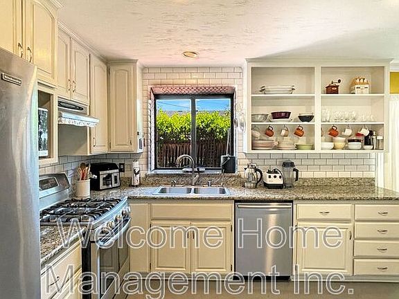 This charming 3-bedroom 2-bath house with living room, dining area, and large kitchen is a perfect place to stay for a month or two. The kitchen is stocked with an air fryer, vitamix, coffee maker, electric kettle and microwave. With its long countertops there is plenty of room for food prep. The living room is large with a comfy couch and a large window with cushions and pillows for extra seating and a smart TV for entertainment. The dining area has a round table with 4 chairs and is adjacent to the kitchen. The three bedrooms can sleep 5 comfortably. The two full bathrooms make getting ready a breeze. With a private backyard complete with a grill and patio furniture you can enjoy the California sunshine most of the year. Enjoy the fruit from the trees when it is ready to pick. The in-house washer and dryer makes laundry convenient. Park 2 cars in the driveway and more on the street as needed. There is one permanent wall air conditioner and one portable room air conditioner that can be moved as needed. All bedrooms have ceiling fans. Amenities: washer/dryer, off-street parking, private back yard