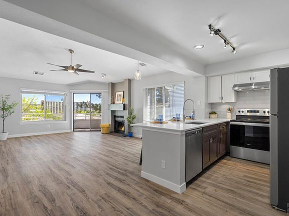 Completely updated 2-bed, 2-bath condo with high-end finishes and thoughtful upgrades throughout! This move-in-ready unit blends comfort, style, and convenience in every detail. The spacious living room features vaulted ceilings, a cozy wood-burning fireplace, and accent lighting that creates a warm, inviting ambiance—perfect for relaxing or entertaining guests. The remodeled kitchen showcases quartz countertops, tile backsplash, soft-close cabinetry, under-cabinet lighting, and a breakfast bar—ideal for casual meals or hosting friends. Fresh paint, new wood laminate flooring in main living areas, and updated light fixtures add a modern touch throughout. Both bedrooms are bright, cozy retreats with two closets each and plush carpet for comfort. The primary suite includes vaulted ceilings and a full en suite bath. Both bathrooms are remodeled with stylish tile work, modern vanities, and updated flooring. Polybutylene pipes were replumbed with PEX throughout, providing reliability and peace of mind. Additional features include accent lighting, window blinds, 6-panel doors, updated baseboards, a new ceiling fan, a 2022 water heater, one assigned parking space, and more. Enjoy year-round comfort with central A/C and unwind on your private balcony with city views and a storage closet. This third-floor condo offers extra privacy, quiet, and wonderful natural light. Conveniently located near parks, a golf course, shopping, and dining. All appliances included—this home is turnkey!
