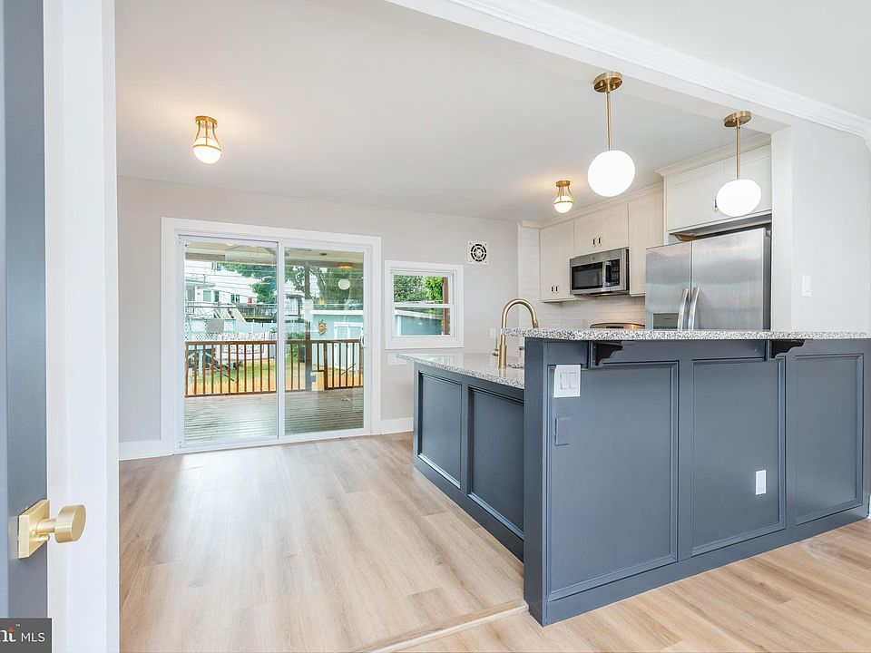Welcome to 3666 N Hereford Ln, a completely renovated three-story home in the desirable neighborhood of Morell Park, Northeast Philadelphia. This stunning property features an open concept design with luxury vinyl flooring throughout, creating a seamless flow between the large living room, dining area, and kitchen. The beautifully renovated kitchen is a chef's dream, boasting Whirlpool appliances, white shaker cabinets, granite countertops, and a kitchen island adorned with shadowbox moldings and designer lighting. A sliding door off the kitchen fills the space with abundant natural light and opens to a deck patio, perfect for family gatherings and grilling. The craftsmanship is evident with crown molding throughout the home, adding a touch of elegance to every room. Upstairs, you will find three spacious bedrooms and a hallway bathroom. The master suite includes a walk-in closet, providing ample storage space. The ground level is fully finished and offers a versatile space with a second kitchen, complete with a built-in refrigerator, sink, and laundry area. This level also includes a half bath and a walk-out to the back patio and backyard, making it ideal for an in-law suite or an entertainment area. This home is equipped with a new HVAC system and updated electric and plumbing, ensuring modern comfort and convenience. The location is unbeatable, with easy access to I-95, Jefferson Hospital, Holy Family University, and various shopping centers. Don’t miss out on this exceptional home that combines luxury, functionality, and a prime location. Schedule a showing today and experience the best of Morell Park living!