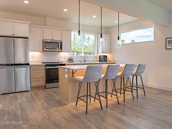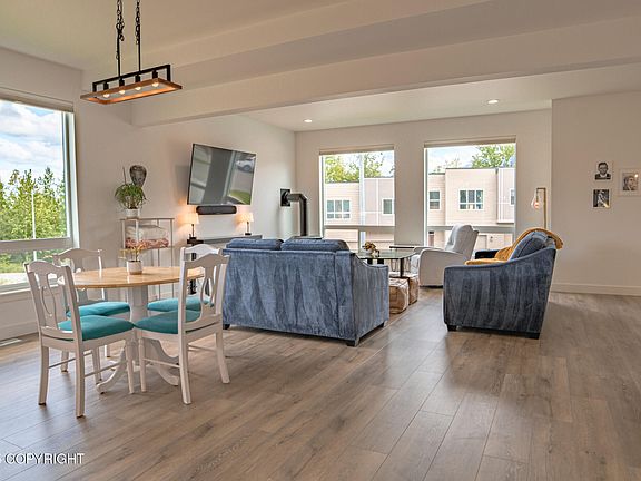 End Unit, Extra Windows, 4 Bedrooms, 3.5 Bathrooms, Heated 2 Car Garage, Laundry Room. Pristine, One Year Old Condo-offers a thoughtfully designed open-concept layout, large picture windows, and a balcony, it's been elevated far beyond the builder's standard with high-end touches you'll immediatelynotice. Highlights 4 Generous Bedrooms (two with en-suites) and 3.5 bathrooms featuring comfort-height toilets and dual high-pressure showerheads. Heated Finished Garage with hot/cold water, digital keyless entry, and exterior light timers. Designer Kitchen with upgraded under-cabinet and under-counter lighting, premium induction stove, and butcher block island. Inviting Great Room anchored by a gas freestanding stove fireplace nestled in the corner for cozy Alaskan evenings. Luxury Touches Throughout: towel warmers in each bathroom, custom top-down/bottom-up blinds, and solid-core doors on all bedrooms and bathrooms for enhanced privacy and soundproofing. Smart Upgrades: USB/USB-C outlets, dimmer switches, Ring doorbell. Neutral Finishes & Ample Storage complemented by expansive sunrise, sunset, and mountain views. Maintenance-Free Living in a pet- and kid-friendly community with no snow shoveling or lawn care required. Bonus Offered semi-furnished with two king bed frames and mattresses, two mounted TVs, a sofa and loveseat, and all appliances, including laundry-each less than one year old with minimal use. Turn-key, move-in ready. No projects, no waiting, just exceptional living with upgrades you must see to fully appreciate. Short commute to JBER and Hospital.
