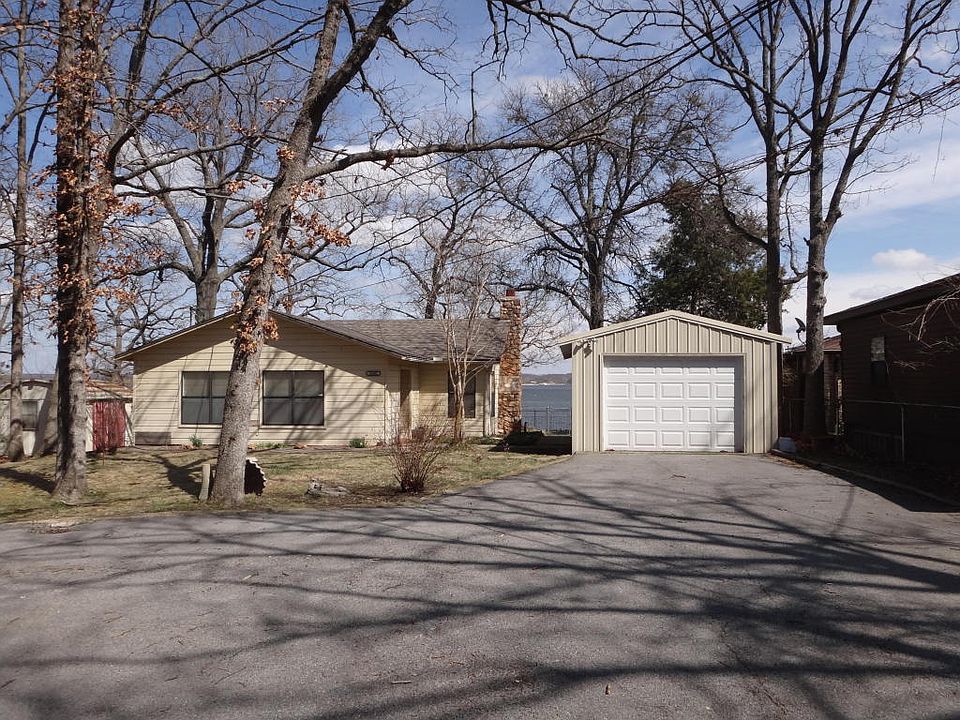 Cottage on the bluff with 75' waterfront and panoramic view of Grand Lake and Pensacola Dam; new swim dock, see gorgeous sunrises from lakeside deck and sunroom, stone fireplace in open living area, freshly painted exterior, newer detached garage and workshop, nice trees and fenced yard, conveniently located near shopping.