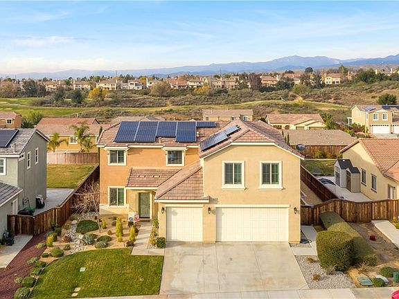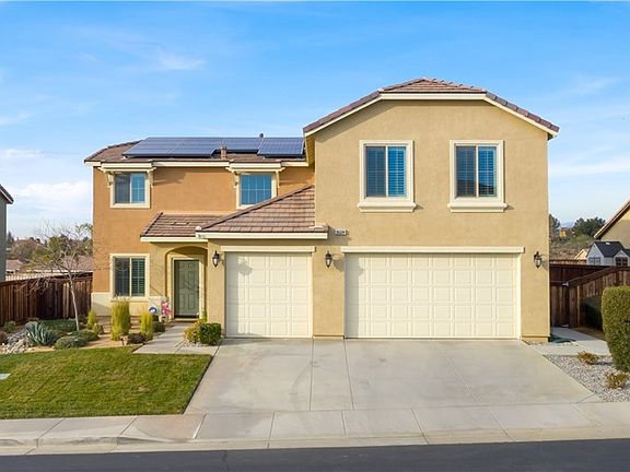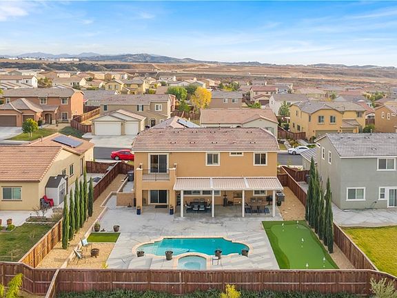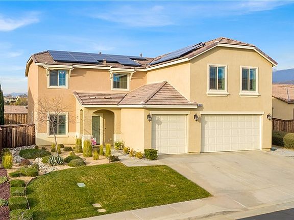 Welcome to Tournament Hills, Beaumont's premier gated residential community bordering the Morongo Golf Club at Tukwet Canyon, located west of the 10 Freeway and crafted by famed homebuilders, Pardee Homes. Behind the dramatic waterfall entry and located just beyond the catch and release lakes and pristine walkways sits this stunning 5 bedroom/3 bathroom executive pool home featuring every imaginable amenity, and more! Chic, laminate wood flooring adorns the main level leading to a sumptuous culinary kitchen, replete with ceiling mount surround sound, stainless appliances, slab granite counters/backsplash and an oversized island for meal prepping and casual dining. A decorative sliding door off the family room reveals a private downstairs bedroom and bathroom. Upstairs, plush double-padded carpeting opens to a sprawling loft retreat, an upstairs laundry room and the remaining 4 bedrooms and 2 bathrooms. A spa-like master retreat with separate shower and soaking tub opens to an outdoor balcony overlooking the golf course and surrounding mountains beyond. The resort-style grounds feature an alumawood patio cover with ceiling fans and lights, drought tolerant landscaping, ornate hardscaping, a sparkling neo-classic pool and spa and your very own multi-hole putting green - all with the privacy afforded by no rear neighbors! Solar paneling makes exorbitant electric bills a thing of the past as you enjoy life to the fullest in your centrally located dream home. Come be amazed!