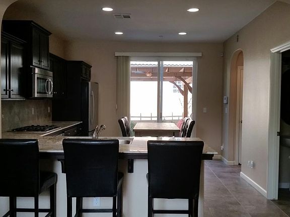 Stainless steel kitchen appliancesGranite countertopsOpen feelingCovered pergolaLarge neutral tileNewer carpet