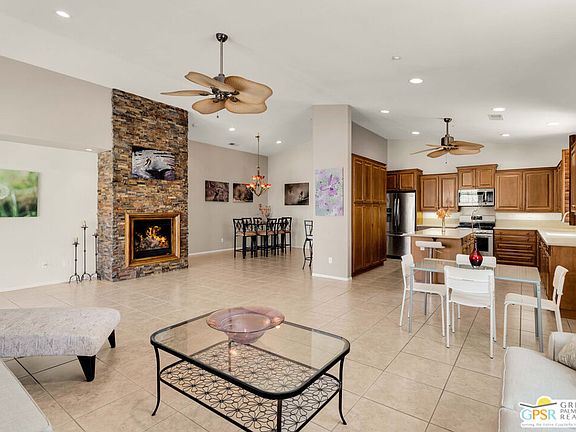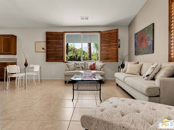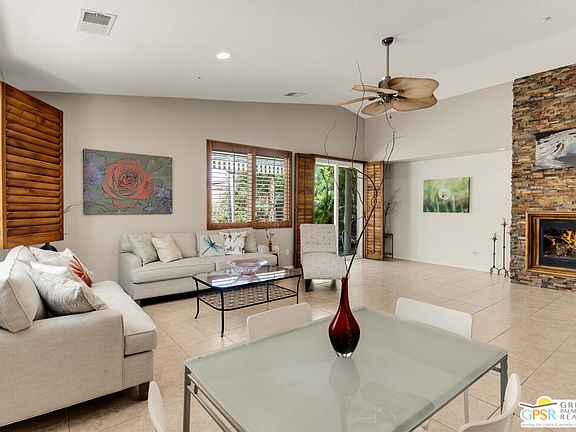 Discover this fabulous 3-bedroom (or 2 bedrooms + Den) Palm Three floor plan located on a quiet cul-de-sac at the exclusive gated Four Seasons active 55+ adult community. This property that sits on one of the largest lots in the community features a great room with vaulted ceilings with a gas fireplace, wood plantation shutters, and tile flooring throughout. The kitchen is perfect for any cook with all of its storage and Caesarstone countertops. The oversized lot, with two large patios, is a landscaper's sanctuary with so many amazing desert plants as well as fig, grapefruit, and lemon trees. The home offers ample privacy due to the unique location and orientation. The living room, kitchen and backyard have stunning views of Mt. San Jacinto. Solar provides power and can be enhanced for electric car charging. The "Lodge" Clubhouse has onsite staff and features a bistro, fitness center, ballroom, library, game room, and more. Additional amenities include heated pools, spas, tennis, pickle-ball, walking trails, and a calendar of social clubs and events. Best of all, your future home is only minutes to shopping and Downtown Palm Springs. Contact your agent for information or to schedule a private showing.