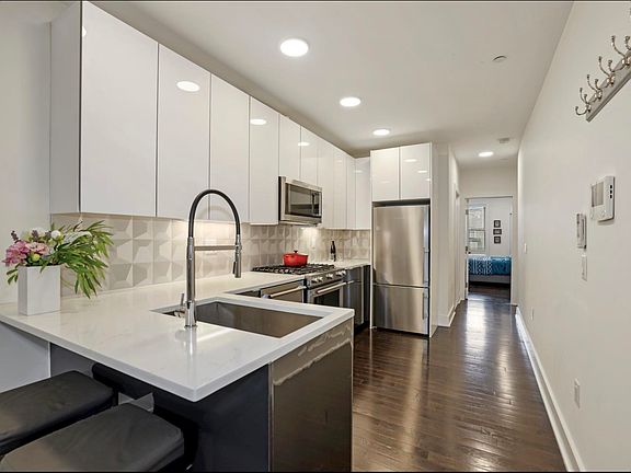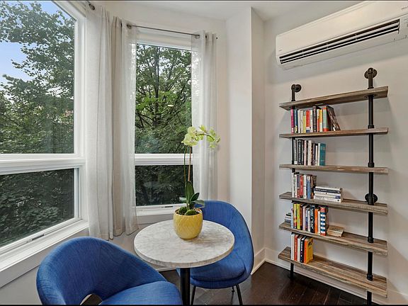 Cool off in this perfect sun-filled home, which is beautifully tailored for sophisticated living. The large living room's bay windows have sweeping views and a cozy ventless fireplace finished with a mid-century inspired accent wall. This opens into a fully loaded kitchen offering dual tone UltraCraft cabinets, Calacatta Botanica Quartz counters with a breakfast bar, stainless appliances from Liebherr and Kitchen Aid and a stylish backsplash. Your stunning bathroom has a floating storage vanity, Toto toilet and glass barn shower doors. Tucked quietly to the back is the spacious bedroom of this better than new construction condo. Espresso oak floors, split dual zone heating/cooling systems, double pane windows and in-unit laundry completes this perfect picture. A common storage area is also available, for your convenience. Situated on a tranquil tree-lined street yet steps to Newark Avenue nightlife, 24 NYC PATH trains, parks, shopping and more. Welcome home!