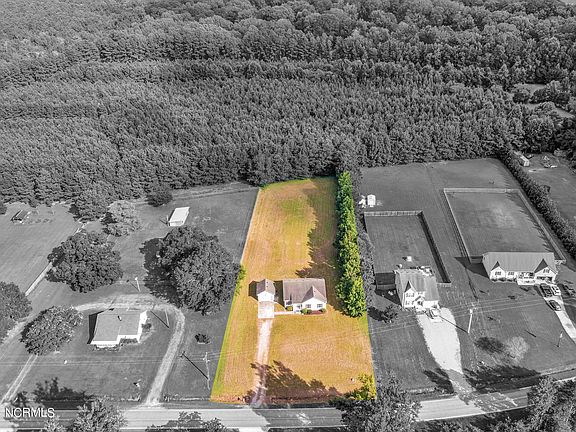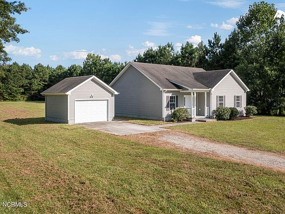 Come experience the country and space you desire, while being minutes away from the VA line, main roads, schools, naval base and shopping in Moyock! This adorable 3 bedroom 2 bath, 1,458 sq ft home sits on .99 cleared acres with a single car detached garage ready for its new owners. This Rancher has over 9 ft ceilings throughout, making the space feel bigger and brighter. All flooring has just been replaced (LVP in all common areas and carpet in bedrooms) and the entire house has been professionally painted and cleaned. Both bedrooms are nicely sized at the front of the house and the large primary bedroom with ensuite sits at the back of the house for ultimate privacy. See this one first! NC license# 319216