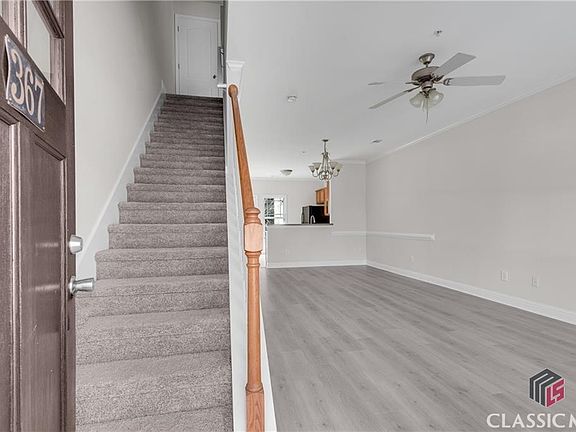 Fresh paint - popular Sherwin Williams "Drift of Mist." NEW RevWood laminate flooring by Mohawk on main and NEW carpet upstairs! NEW 2" blinds . 9' smooth ceilings on main. Open concept plan - living room open to dining room. Half bath on main. Tile kitchen includes refrigerator, NEW built-in microwave + walk-in pantry. Washer/dryer included. Roommate style floor plan features two vaulted bedroom suites both with private bathrooms. Rear patio w/storage room. Parking pad behind unit. Also plenty of on street parking in front. Bring your investors - NO RENTAL restrictions. Swimming pool community. HOA covers lawn maintenance, exterior maintenance and trash service. Just 10 mins to UGA campus.