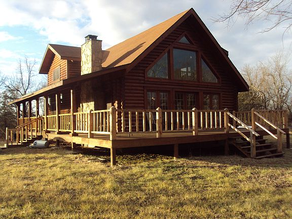 Railings on deck, porch and inside staircase built from trees on the property. Custom cabinets throughout. Jetted hot tub in master bath on ground floor. 2 car detached garage. Well-house with fruit cellar. 30 minutes from Lake of the Ozarks. 45 minutes from FLW. Perfect for retirement or a family wanting to get back to nature.