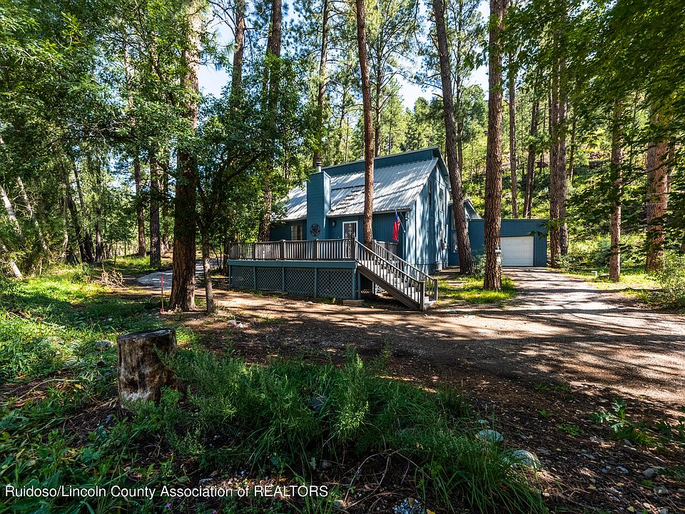 367 River Trail is a 3 bedroom 2 bath on 2.5 +/- acres on several hundred feet of the Rio Ruidoso River! Enter from large river facing front deck into a spacious living room with a rocked wood-burning fireplace. Dining area off kitchen. Main level master bedroom with full bath. Gallery with a high ceiling, bright natural light that leads into a workshop / artist studio. 2 bedrooms upstairs, one with a balcony. Full Jack & Jill bathroom. Metal roof, composite decking, refinished wood floors, new interior paint. Single car garage. Additional acreage can be developed or left for greenspace and wildlife. This home is the perfect place to get away and create art while listening to the sounds of the river and wildlife. In addition, refrigerator, washer/dryer, KS mattress are new.